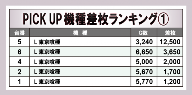 『L 東京喰種』から万枚OVERが生まれ、さらには『Lパチスロ ダンベル何キロ持てる?』で9,000枚OVERと続き、店内の熱気をリードする存在となっていた。全体的にスマスロのみならず、『ジャグラー』シリーズや『パチスロ炎炎ノ消防隊』といったメダル機の活躍も確認できるため、あらゆる機種にチャンスが潜んでいたと言える。