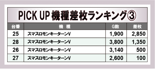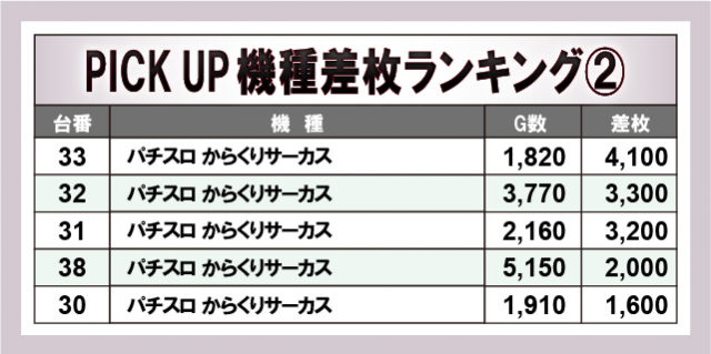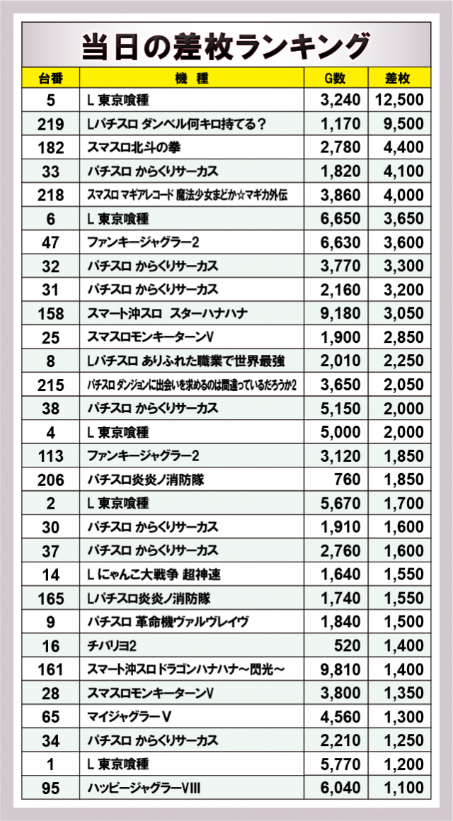 上表の4機種から4桁プラス台が複数発生し、ファンが自信をもってレバーを叩いていた様子が目に浮かぶ。またAT機のみならず、ノーマル機の『ファンキージャグラー2』でも優秀台がうまれており、スペック問わずに活躍していたことから、同店の力強さが窺える内容となっていた!
