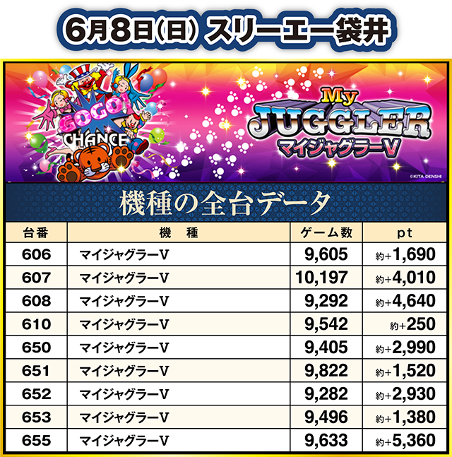 「マイジャグラーⅤ」の655番台が約+5,360pt!
