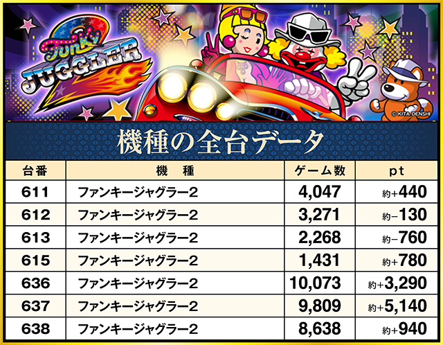「ファンキージャグラー2」の637番台も約+5,100ptオーバー。