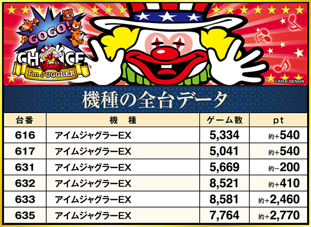 「アイムジャグラーEX」も6台中5台がプラスとなり、2台が約+2,400ptを上回った。