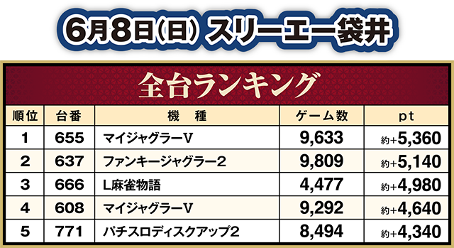 ほかにも、「L麻雀物語」の666番台と「パチスロディスクアップ2」の771番台が約+4,300ptを超えた。
