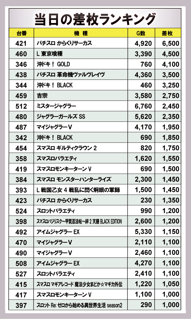 『パチスロ からくりサーカス』から+6,000枚OVERが発生!他にもまとまった出玉を獲得している台があり、遊技していたファンは笑顔を浮かべていた。優秀台にはAT機からノーマル機に至るまで幅広い機種が名を連ねており、誰もが手応えを感じていたのではないだろうか。