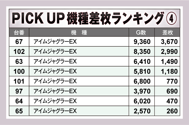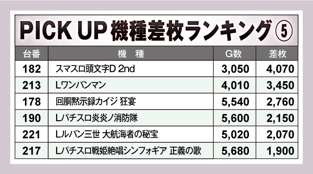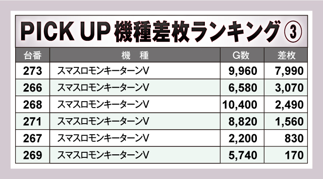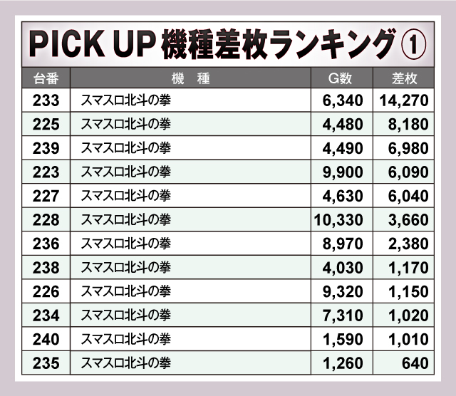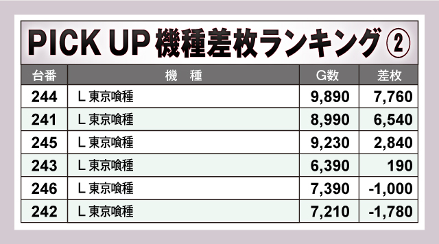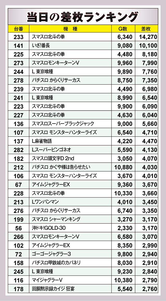 まずは差枚ランキングのチェックから。なんと30台すべてが差枚+2,000枚オーバーを記録し、+3,000枚オーバーは24台、+5,000枚オーバーは11台出現しており、さらに大台突破の+10,000枚オーバーは2台出現するほどの盛り上がり! それらのなかでもっとも優秀だったのは、233番台の「スマスロ北斗の拳」で、差枚はなんと驚異の+14,270枚をマーク! その他ランクイン機種をチェックすると、「L 東京喰種」や「スマスロ モンスターハンターライズ」など人気スマスロ機種がランクイン。さらにノーマルタイプも複数ランクインしていたので、楽しめる機種はアチコチに出現していたようだ!