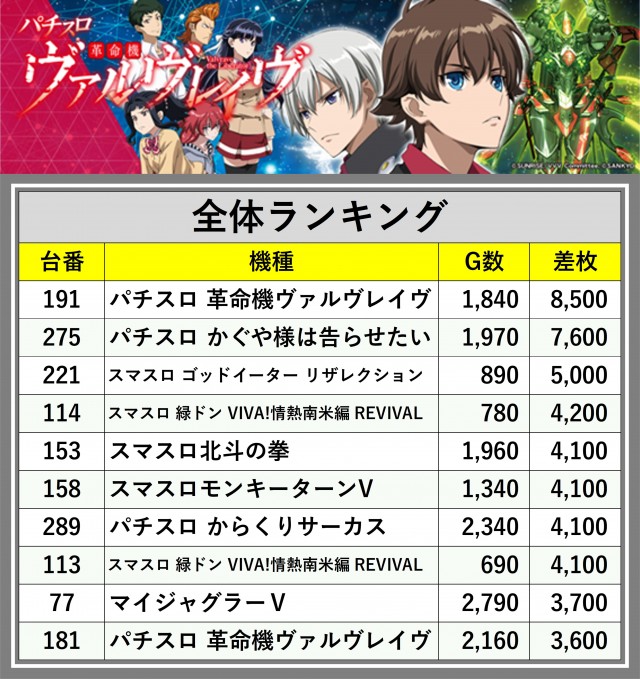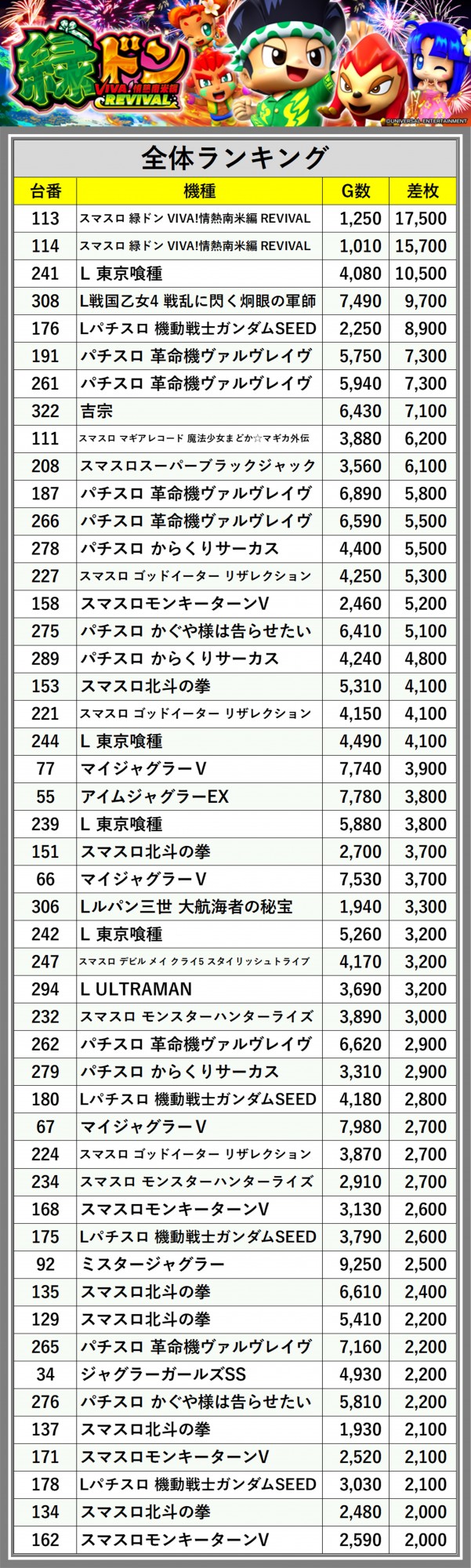 厳選された取材対象機種をはじめ、その他スロット全体から好記録が飛び出した!プレイヤーが楽しんだ1日を下記データにて振り返ってみて欲しい。