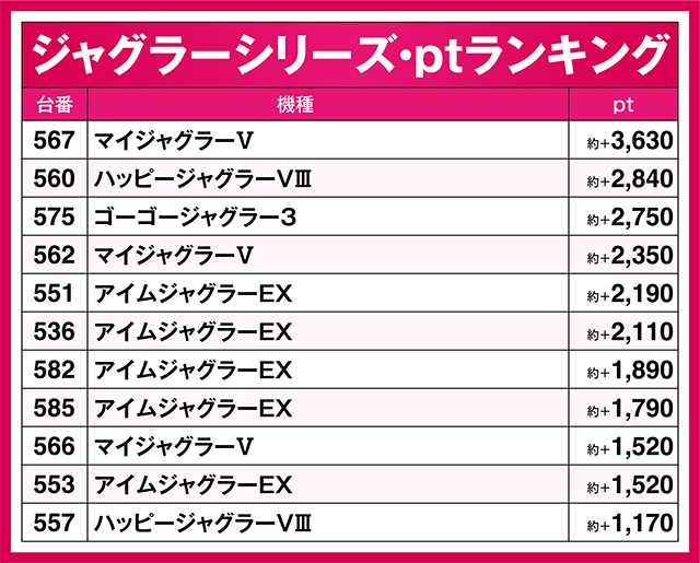 「ハッピージャグラーVⅢ」も2台が約+1,100pt以上で、560番台が約+2,840pt。