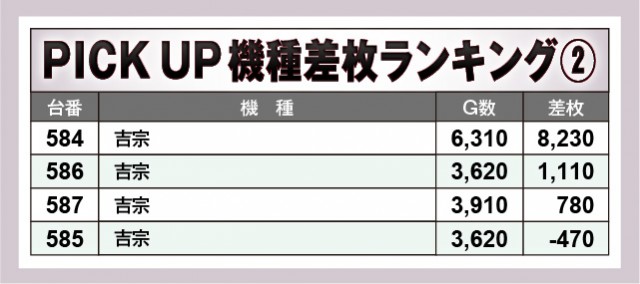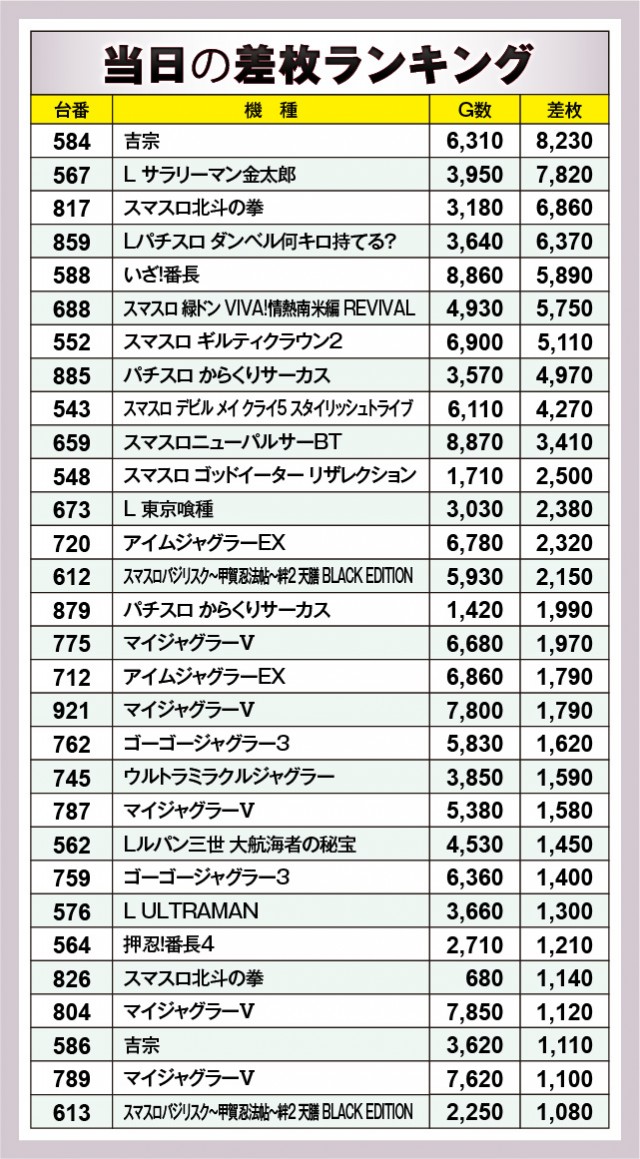 上表をご覧の通り、当日は館内に設置された幅広い機種が活躍していた印象を受ける。その中で『吉宗』『L サラリーマン金太郎』から7~8,000枚OVERが飛び出し、盛り上がりを牽引していたのが鮮烈であるばかり。他にも大台突破を果たしており、何よりも『ジャグラー』シリーズが回転数と差枚数が比例する展開を披露していた点も見逃せない。ファンは笑顔でレバーを叩いており、心から遊技を楽しんでいたことだろう。