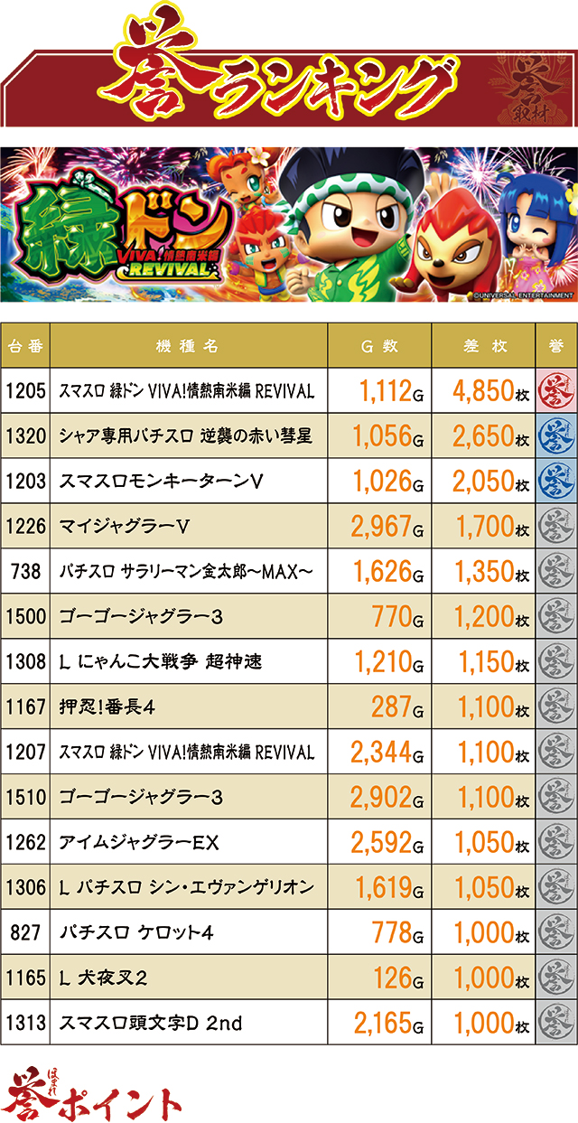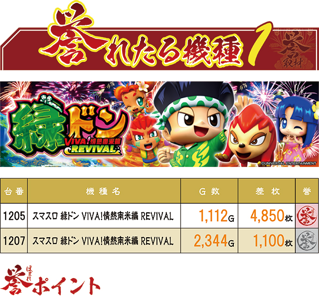 前日の誉取材に続き、この日も最高差枚記録を生み出したのは『スマスロ 緑ドン VIVA!情熱南米編 REVIVAL』だった。前日と異なるのは、この日は5,000枚に届かない差枚数値だったこと。また赤誉マーク(=3,000枚以上)はこの1台だけであり、前日の誉ランクングと比較するとやや寂しい結果となった。