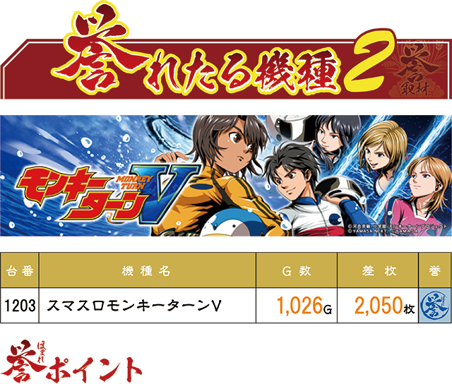 前日の5/31には4,500枚オーバー記録を叩き出した『スマスロモンキーターンV』だが、この日は3,000枚超えは叶わず…。それでも誉ランキング上位に絡んでくるあたり、今後も要注目機種と捉えるべきか。