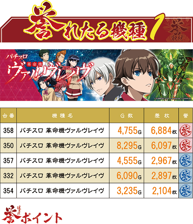前回も暴れまくって誉レコード(=1,000枚以上)を量産した『パチスロ 革命機ヴァルヴレイヴ』は、この日もパチスロ島の盛り上げに貢献。2台の赤誉マーク(=3,000枚以上)はともに6,000枚を上回るほど快調に当てまくっていた!