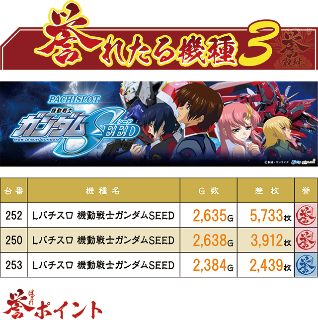 『Lパチスロ 機動戦士ガンダムSEED』は、設置の1/3が誉レコードに。特に挙動が良好だった252番台は、安定した動きで5,500枚を突破!