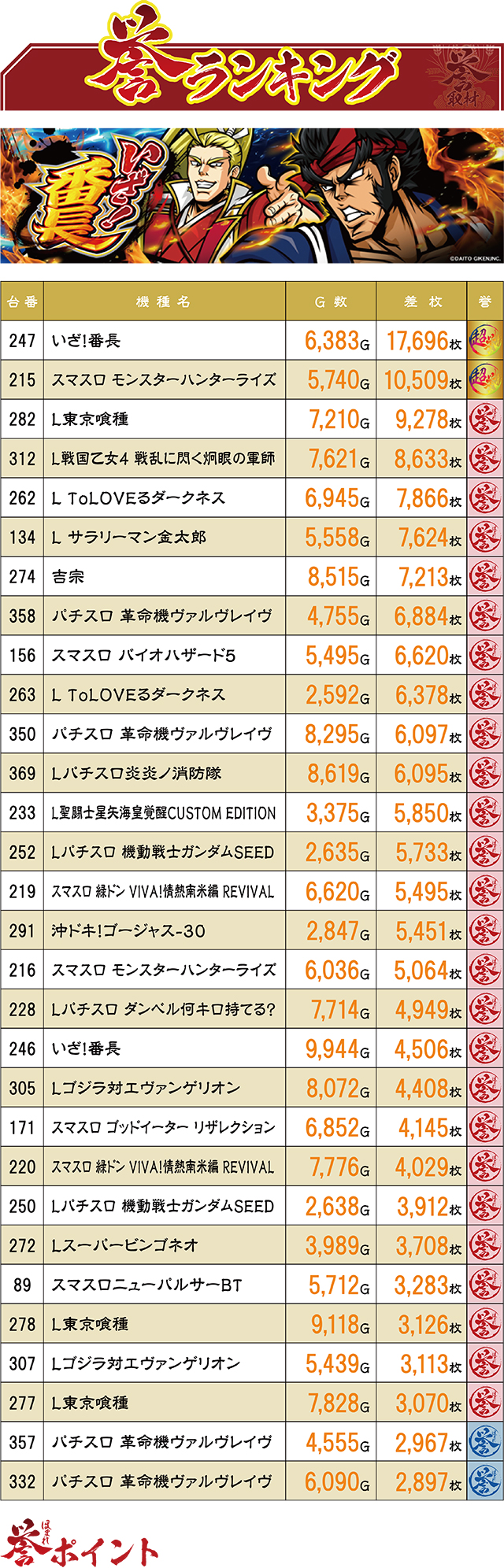 『いざ!番長』と『スマスロ モンスターハンターライズ』から10,000枚オーバー記録が誕生!その下にはさまざまな機種から生まれた3,000枚オーバー記録がズラリと並ぶ。注目は人気マシンが複数台に渡ってランクインしていることだろう。
