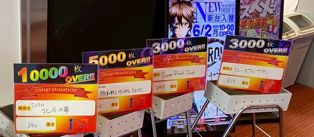 30台がオール4桁以上のプラスに成功。さらに、+2,000枚以上は22台、+3,000枚以上は8台、+4,000枚以上は6台、+6,000枚オーバーは3台、そして万枚を奪取したのは1台と、久しぶりの大台突破に店内も大きな盛り上がりが感じられた。