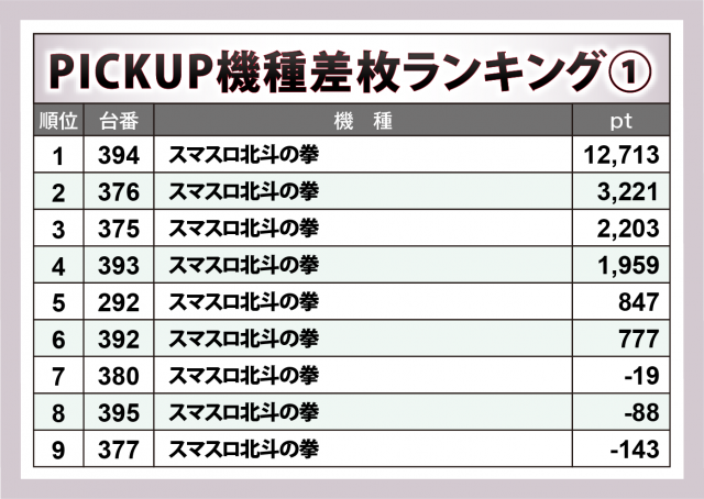 『スマスロ北斗の拳』は394番台の+12,700枚超を筆頭に9台中6台が勝利、+3,200枚超・+2,200枚超・+2,000枚弱が1台ずつと、本日随一の好況となった。