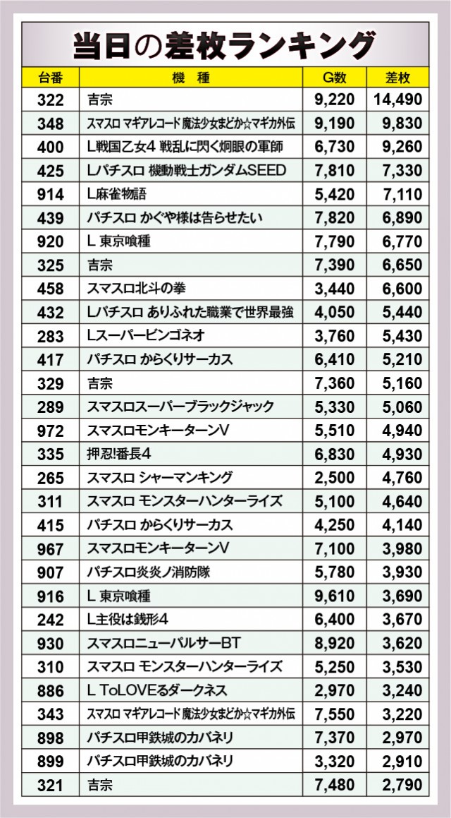 ※差枚数順に掲載しています。