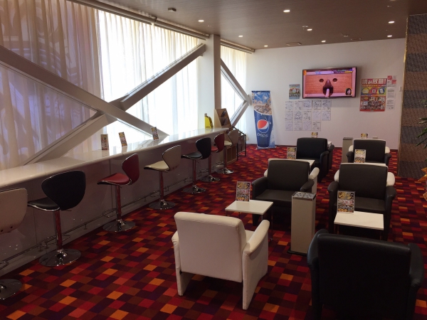 バーカウンターのようなカフェスペースもお洒落。遊技の合間にソファなどでくつろげることもできて快適な空間となっていた。