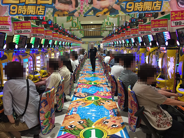 取材日は朝から多くのプレイヤーが集まり、開店直後は主にパチスロコーナーが活況で、「バジリスク~甲賀忍法帖~絆」や「押忍!番長3」を中心に盛り上がりをみせた。
