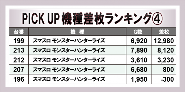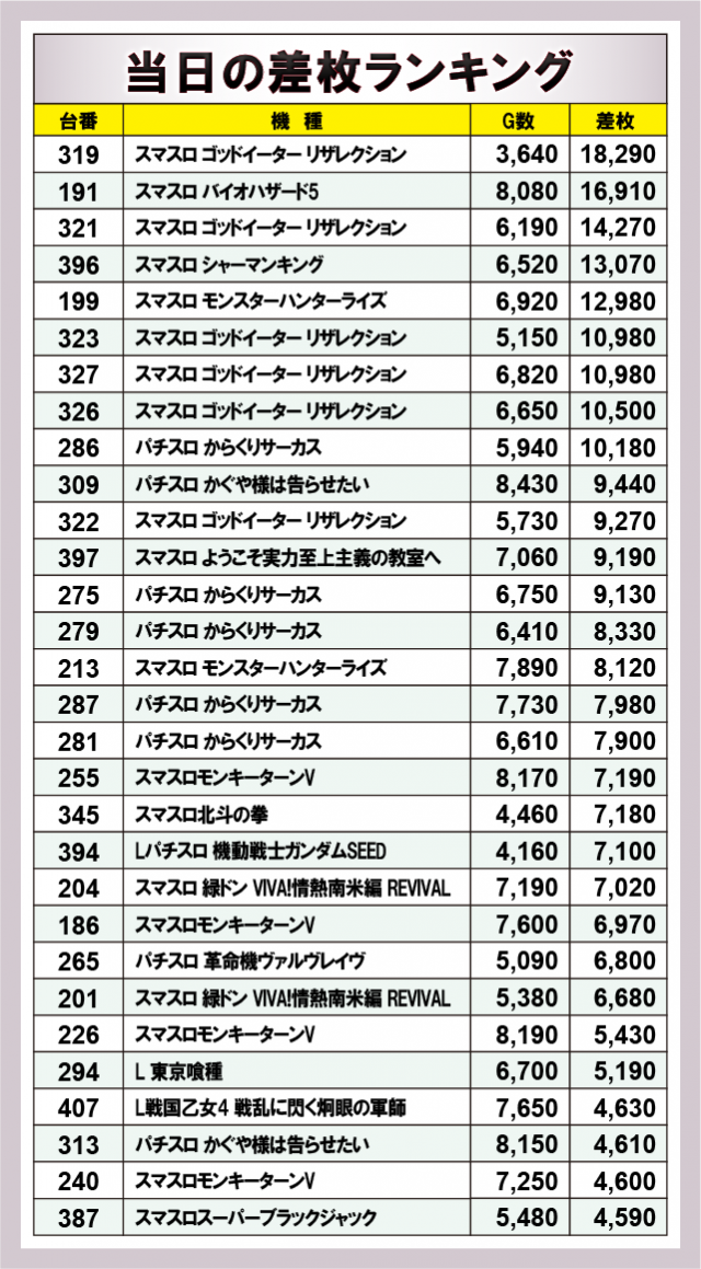 上表をご覧の通り、当日は合計9台の万枚OVERが発生。コンプリート目前の+18,290枚を記録した『スマスロ ゴッドイーター リザレクション』は計5台の万枚OVERと大きな熱気を放っており、他の台も触発されたかのように気を吐いていていた。また特筆すべきは、TOP30は4,000枚から名を連ねているという点だろう。店内各所にポテンシャルを秘めた台が存在し、それを納得するまで遊技し続けたファンの姿も見られたことから、類を見ない盛り上がりを披露した1日になったようだ。