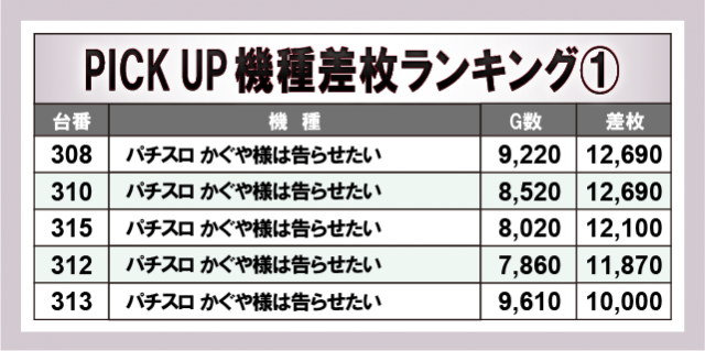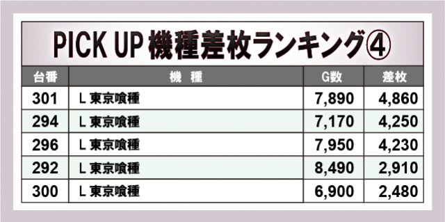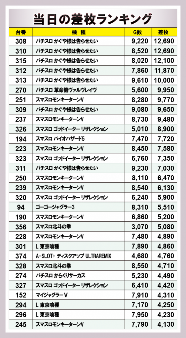 万枚OVERが5台発生した『パチスロ かぐや様は告らせたい』の活躍はもちろん、『スマスロモンキーターンV』『スマスロ ゴッドイーター リザレクション』『L 東京喰種』といったスマスロ定番機種から軒並み好記録がうまれている。また、侮れないのがノーマルタイプだ。『ゴーゴージャグラー3』では5,000枚OVERがうまれ、他にも4桁プラス台が複数発生し、GOGOランプの輝きが遊技するファンの癒しとなっていたことだろう。何よりも上表の機種を筆頭に終日を通して打ち込まれた形跡を示しており、ファンは嬉々としてレバーを叩いていたはずだ。