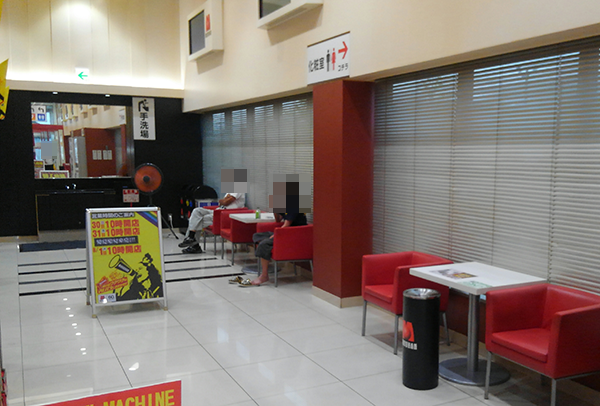 個室の休憩スペースはガラス張りとなっており、遊技の様子もみることができる。シマの近くにもソファが設置されているため、空き台を待つ時間などもリラックスしつつ過ごせそうだ。