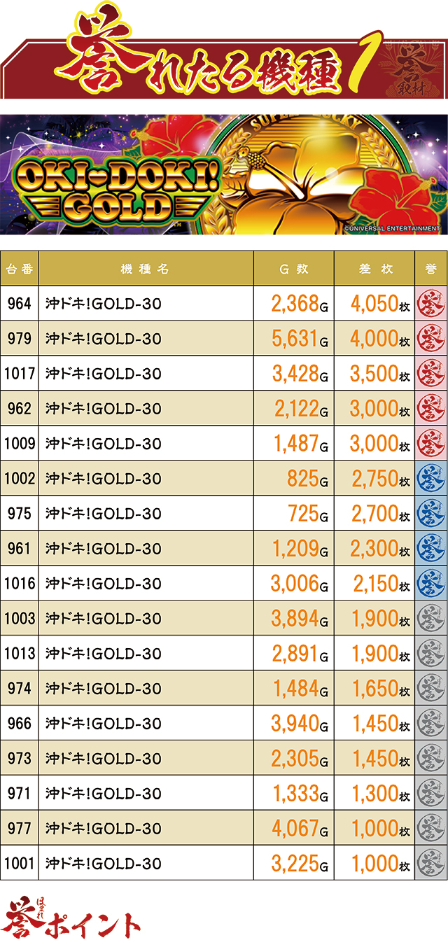 40台(!)もの設置を誇る『沖ドキ!GOLD-30』から大量の誉レコード(=1,000枚以上)が生まれるのはお約束。この日も17台の誉レコードが出現し、沖ドキファンを存分に楽しませてくれた。