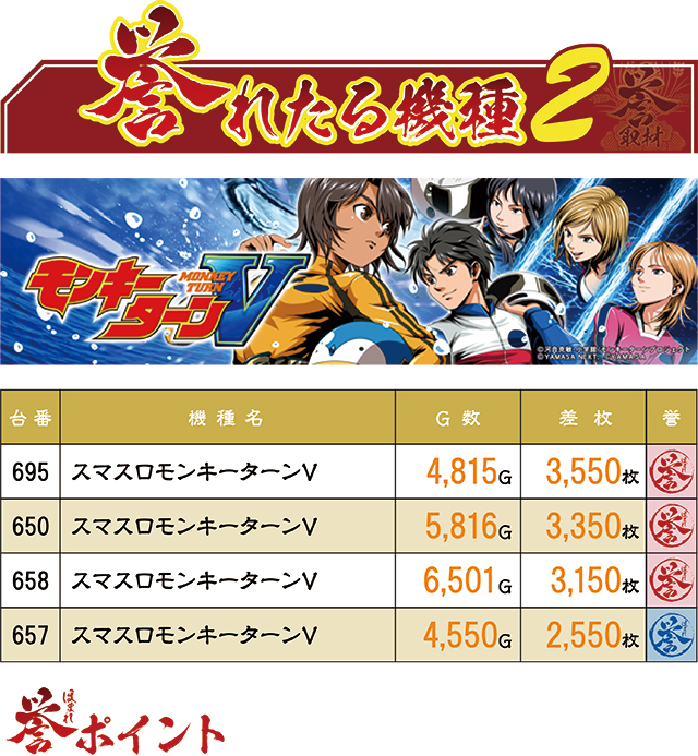 『スマスロモンキーターンV』からは4台の誉レコードが誕生。内3台が赤誉マーク(=3,000枚以上)となっていたが、前回のような9,000枚超えレコードが生まれなかったことだけが悔やまれる…。