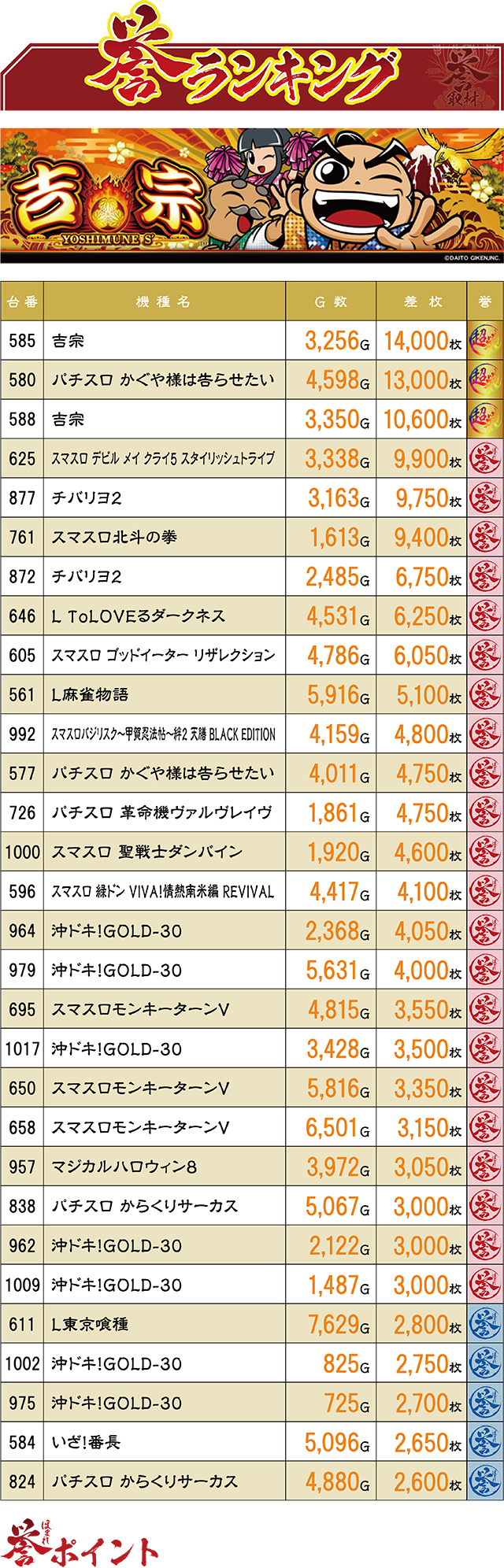 前回5/30に引き続き、またしても3台の10,000枚オーバー記録を生み出した「Super D'STATION39佐々インター店」。前回10,000枚超えレコードを生み落とした『吉宗』から、今回も2台の10,000枚超えが誕生した。また、わずかに10,000枚には届かなかったものの、新台の『スマスロ デビル メイ クライ5 スタイリッシュトライブ』が4位に堂々のランクイン!