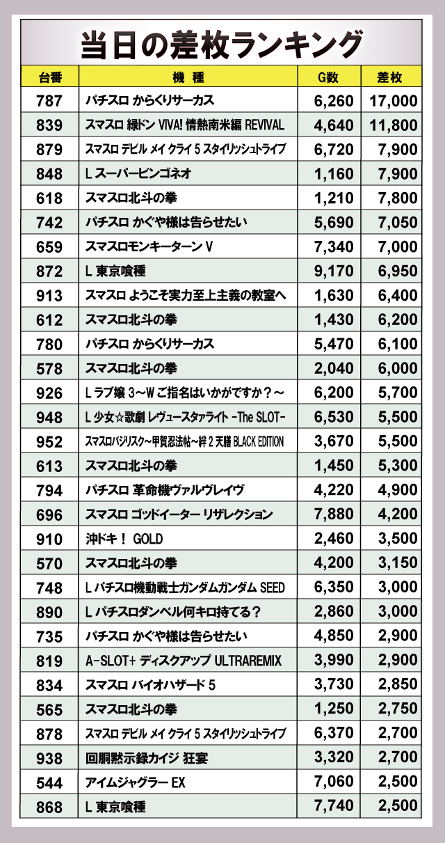 『パチスロ からくりサーカス』から+17,000枚、『スマスロ 緑ドン VIVA!情熱南米編 REVIVAL』から+11,800枚と2台の万枚OVERが発生した。これらに引っ張られるようにして、店内各所でまとまった出玉を獲得する台が多発!大きな熱気にファンは笑顔をこぼしていたが、それもまた打ちごたえのある状況が相まってのことだろう。