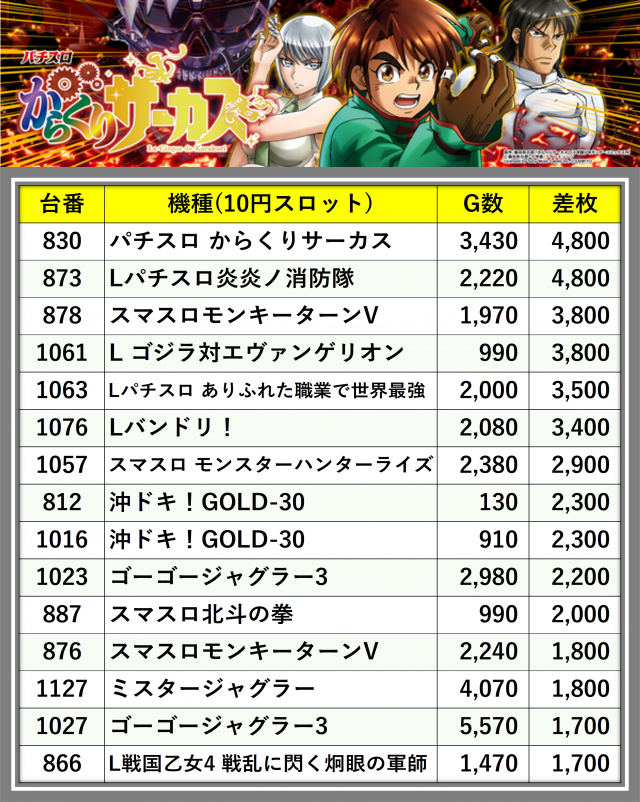 厳選された取材対象機種をはじめ、その他スロット全体から好記録が飛び出した!プレイヤーが楽しんだ1日を下記データにて振り返ってみて欲しい。