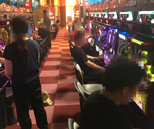 取材日もたくさんのプレイヤーが来店。明るい雰囲気がパチンコとパチスロの各シマに広がっていた。