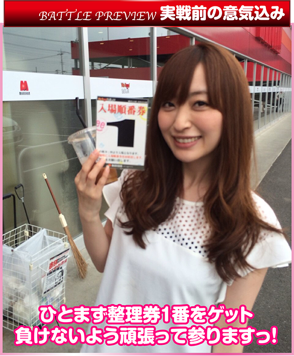 今回、女子スロッターNo.1を決めるということで、ヒキには自信がありませんが(笑)、ヤル気とスロットが好きという気持ちはNo.1! という思いを胸に参戦致しました*\(^o^)/*