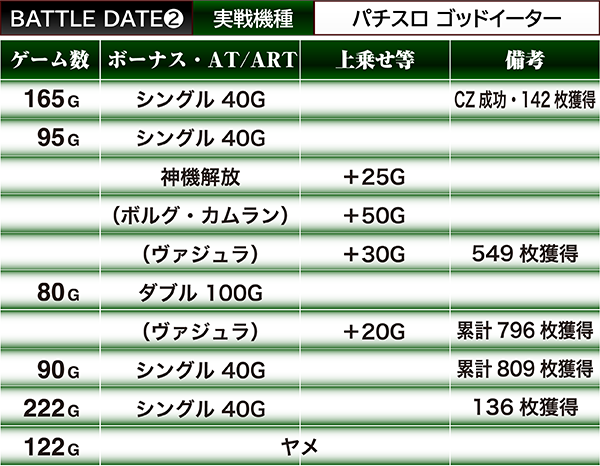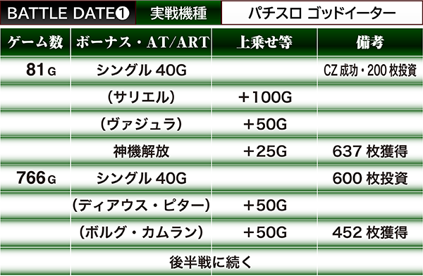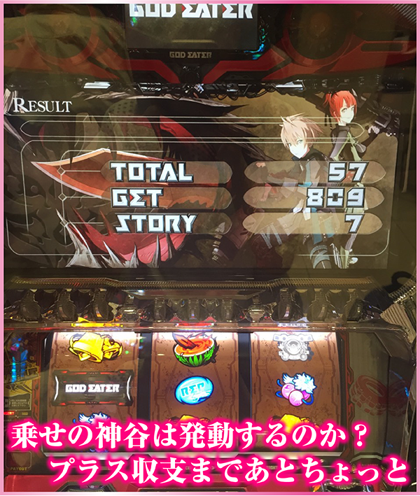 この時点で全投資枚数は800枚。唯一、助かったのはゴッドイーターは天井が777Gと低いところ! ふぅ。とりあえず使った分は取り返したいと挑んだバトルは…結果ストーリー3で終了(;д;)