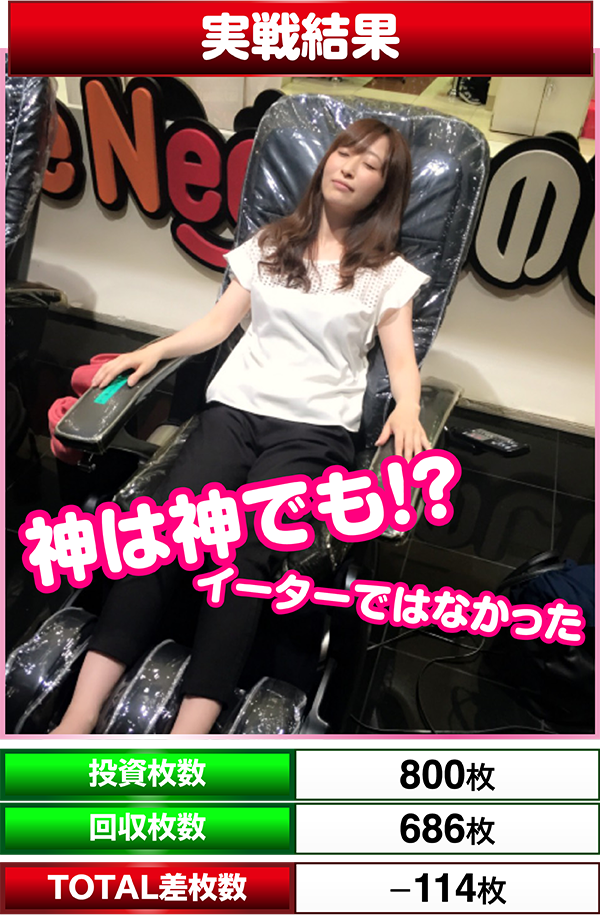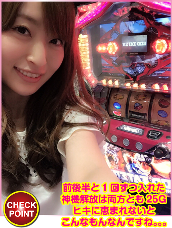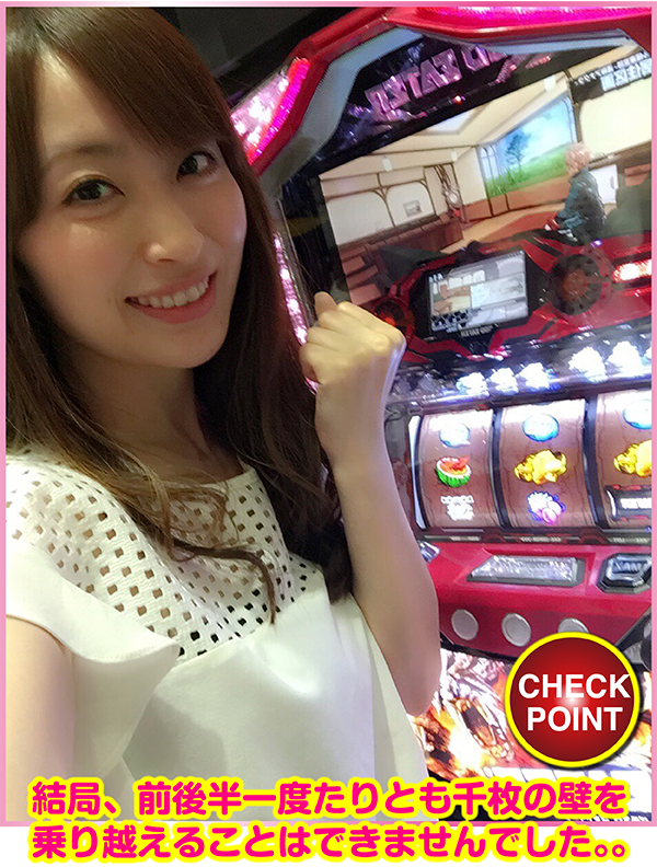 でもね、やっと来たの! 本日初めての赤7ダブルライン!! そう、初期ゲーム数が100Gからという大チャンス!! 「乗せるの? 乗せられないの?」…そんなこをぶつぶつ言いながら、レバーを叩くものの、乗せの神谷が発動しない。今日はダメみたいだ。結局これといった乗せもないまま実戦時間終了。もどかしいけど仕方ない。今回の戦いは時間との勝負でもありますからね。