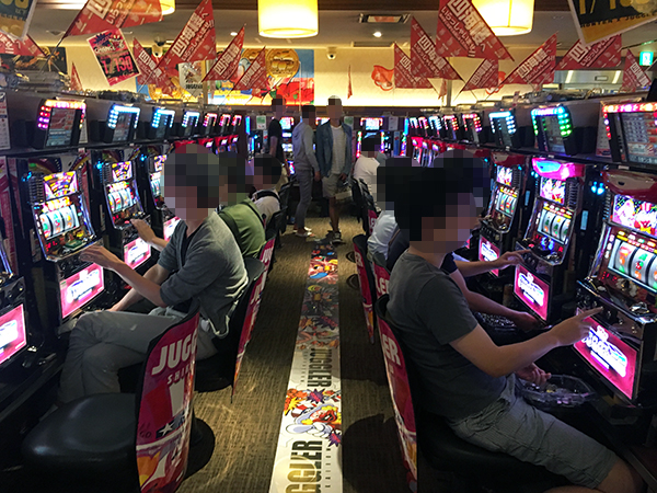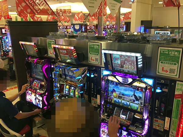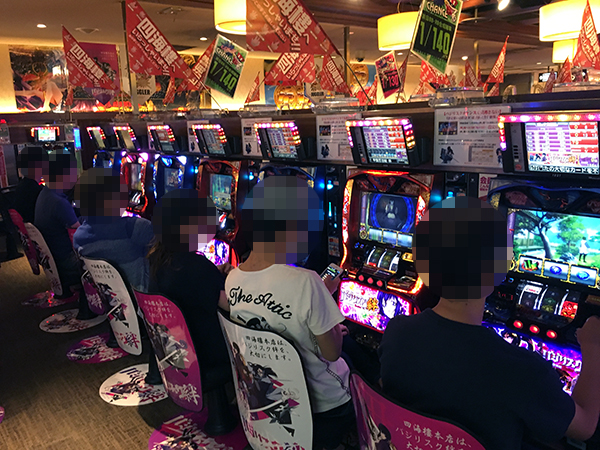 5円パチスロも活況。プレイヤーたちの表情からも、充実した時間を過ごせていることがうかがえた。