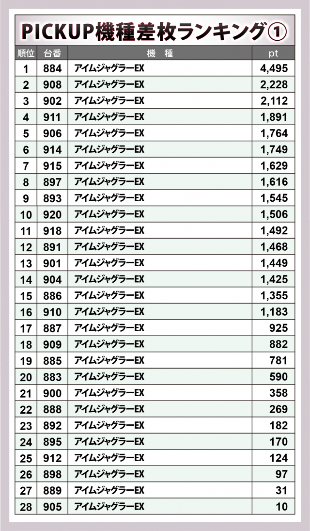 『アイムジャグ』40台はプラス台数の多さが目立った。しかも884番台が+4千5百弱とシリーズ一番の数字を叩き出した他、+2千超が2台・+1千超が13台と、店内有数の盛り上がりに達していた。