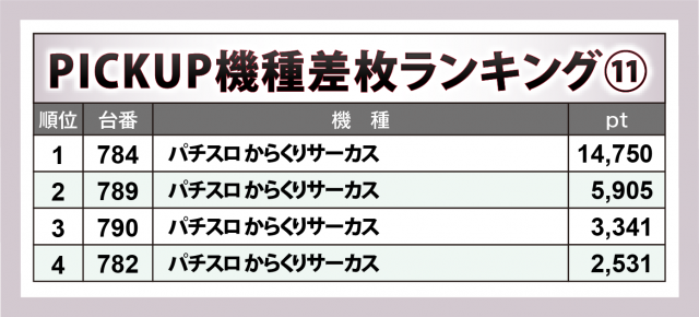 『パチスロ からくりサーカス』10台ではプラス達成は少なめだったが、784番台が+1万4千8百弱で全401台の王座を射止めた上に、+5千9百超・+3千3百超・+2千5百超と、重量級の出玉がズラリ。
