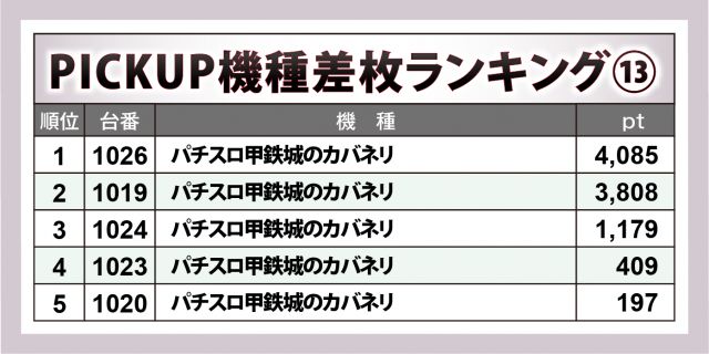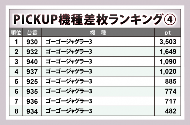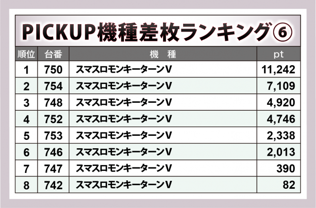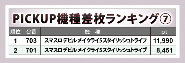 加えて、『L ゴジラ対エヴァンゲリオン』738番台に+9千8百超、『忍魂参 ~奥義皆伝ノ章~』951番台に+6千7百弱、『沖ドキ!BLACK』663番台が+5千8百超、『いざ!番長』1041番台に+5千7百弱、『吉宗』697番台に+5千超と、幅広いラインナップが好調台を生み出していた。