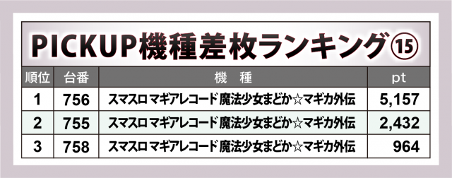『スマスロ マギアレコード 魔法少女まどか☆マギカ外伝』6台も半数がプラスを成し遂げ、+5千2百弱・+2千4百超が1台ずつと、優秀台のpt数は高かった。