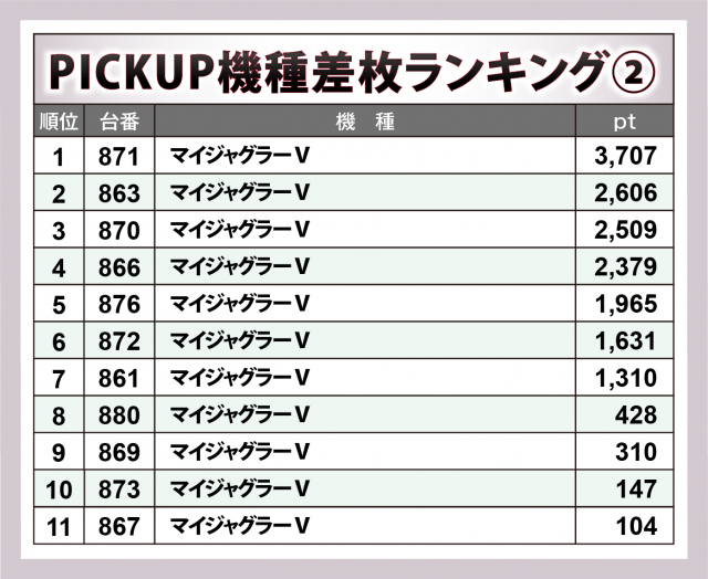 『マイジャグ』20台は半数超が勝利に。871番台が+3千7百超となったのを皮切りに、+2千超・+1千超が3台ずつと、『アイムジャグ』に負けない出来となった。