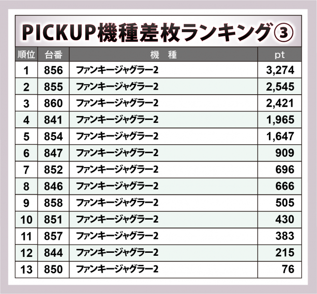 『ファンジャグ』20台も勝率は上2つに匹敵。856番台の+3千3百弱を筆頭に+2千4百付近・+1千6百超が2台ずつと、数値面でも中々のものだった。