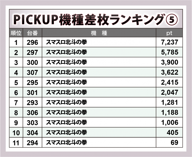 『スマスロ北斗』20台もジャグラーシリーズに勝るとも劣らないプラス台割合で、296番台が+7千2百超でコーナートップに。他にも+5千8百弱が1台、+3千6百超・+2千超が2台ずつ、+1千超が3台と、波の荒いスマスロの中でも安定感は抜群だった。