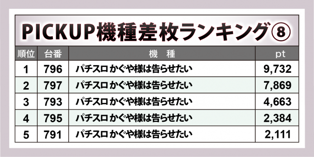 『パチスロ かぐや様は告らせたい』10台もちょうど半分がプラスを収めた。万枚突破こそなかったが全台が+2千1百超、他にも+9千7百超・+7千9百弱・+4千7百弱が1台ずつと、ここまで紹介した機種に引けを取らなかった。