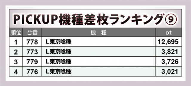 『L 東京喰種』8台も半数の4台がプラス、778番台が+1万2千7百弱でシマの頂点に輝き、他3台も+3千超と、クオリティは高かった。