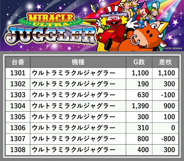 厳選された取材対象機種をはじめ、その他スロット全体から好記録が飛び出した!プレイヤーが楽しんだ1日を下記データにて振り返ってみて欲しい。