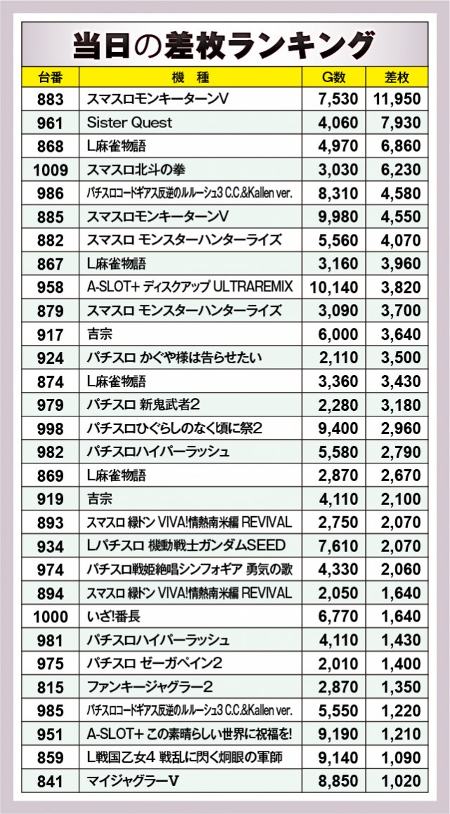 ※差枚数順に掲載しています。