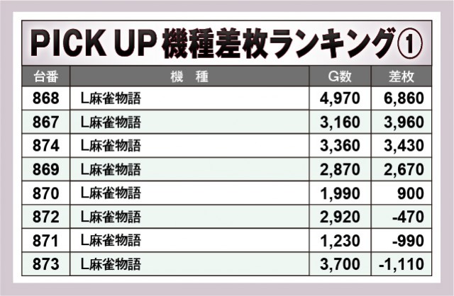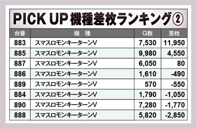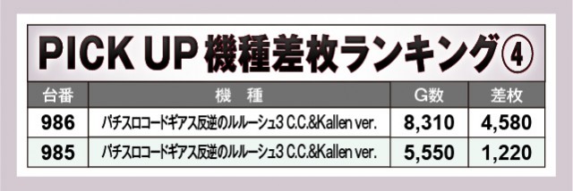 『L麻雀物語』から6,000枚OVER、『スマスロモンキーターンV』では万枚OVERが飛び出すなど、優秀機種から放たれた熱量は説明不要だ。後者は開店から閉店までじっくりと打ち込まれ、ファンは大きな手応えとともに高みを目指していたに違いない。また『パチスロハイパーラッシュ』『パチスロコードギアス反逆のルルーシュ3 C.C.&Kallen ver.』は全台プラス差枚数を達成しており、こちらも存在感を放っていた機種と言える。