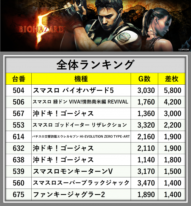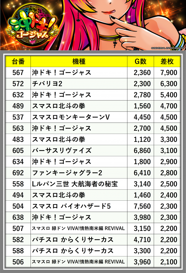 厳選された取材対象機種をはじめ、その他スロット全体から好記録が飛び出した!プレイヤーが楽しんだ1日を下記データにて振り返ってみて欲しい。