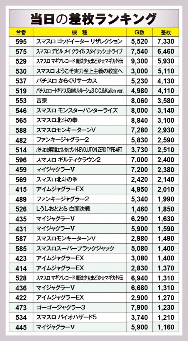 ※差枚数順に掲載しています。