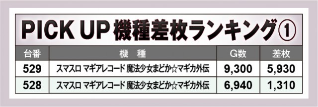 優秀機種として名を連ねた『スマスロ マギアレコード 魔法少女まどか☆マギカ外伝』『パチスロコードギアス反逆のルルーシュ3 C.C.&Kallen ver.』『スマスロ ギルティクラウン2』は、いずれも全台プラス差枚数を達成。そのポテンシャルは遊技していたファンがよく理解しており、回転数からも見て取れる。そして9,000回転台と開店から閉店まで打ち倒された台もあって、有意義な時間を過ごせたのは間違いない。