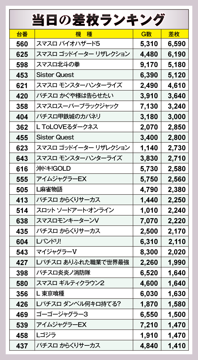 『スマスロ バイオハザード5』560番台が+6,590枚で首位を獲得。そして『スマスロ ゴッドイーター リザレクション』625番台が+6,190枚でおしくも2位となっている。そのあとは『スマスロ北斗の拳』598番台が+5,180枚、『Sister Quest』453番台が+5,120枚とつづく。以下、『スマスロ モンスターハンターライズ』621番台の+4,610枚など、優秀台が並ぶ見応えのあるランキングが出来あがっていた。